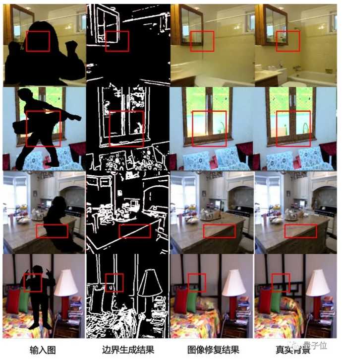 一套组合拳下来,测试的结果如下。从左到右,分别是输入图像、边界预测、脑补结果和实际背景。