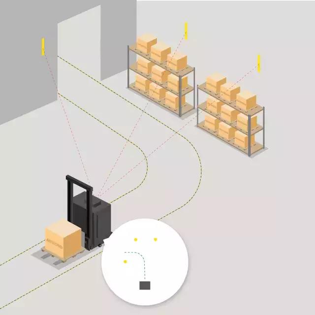 2. 激光导航:一般在高位(2m左右)的墙面设置反光板,通过机器人上面的定位激光雷达测量带坐标信息的反光板,对机器人进行高精度定位,然后在软件层面生成虚拟导引线,机器人能够沿着虚拟导引线移动。