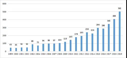 进一步分析关于人工智能产业核心技术研究的3681篇论文,本文以时间序列的形式统计出每年的论文数量,通过Excel绘制了Web of Science收录的关于人工智能产业核心技术研究的文献数量统计图(如图1所示)。二十年间,全球对人工智能产业核心技术的研究越来越重视,发文量整体呈上升趋势。20世纪末,全球的发文量较低,这受到当时全球人工智能技术的基础研究、理论模型及数据样本等影响和限制。发文量激增阶段:2010-2019年,这与人工智能爆发阶段的时间相吻合,也与算法、算力的提升及数据的激增等现状密切相关。