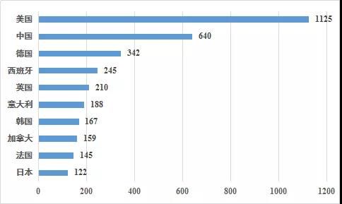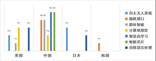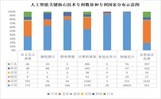 图5人工智能产业核心技术专利数量和专利国家分布示意图