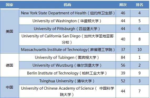 根据所检索的文献,对研究机构的发文量与合作情况进行整理,从机构发文量来看,其中德国图宾根大学发文量最多,高达84篇,说明其在人工智能产业核心技术研究领域具有一定的影响力;其次,发文量较多的是德国维尔茨堡大学(56篇)、中国清华大学(52篇)和美国纽约州卫生部(46篇),这些机构在人工智能产业核心技术研究中作为重要的力量,推动着产业核心技术不断实现技术突破与发展。从全球分布来看,如表3所示,发文量排名前10位的研究机构主要分布在美国、中国和德国。
