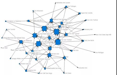 为了进一步分析各研究机构的合作情况,本文采用Ucinet分析软件生成全球人工智能产业核心技术研究机构合作网络图(如图4所示)。图中每一个小方块代表一个研究机构,方块越大说明该研究机构与其他研究机构合作越多。其中,德国图宾根大学、维尔茨堡大学和格拉茨技术大学与其他研究机构合作较为频繁。我国两所研究机构:中国科学院大学和清华大学已开展大量的基础研究工作,并与加利福尼亚大学圣地亚哥分校和哈佛大学进行了密切的合作研究。从总体上看,我国研究机构之间合作密度较低,研究领域较为分散。无论从发文数量还是从机构合作网络图来看,德国图宾根大学、维尔茨堡大学和纽约州卫生部是全球人工智能产业核心技术研究的主要力量。