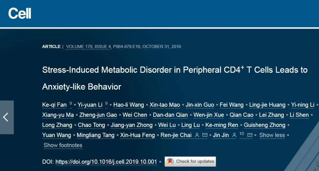2019年10月31日,浙江大学靳津和东南大学柴人杰 共同通讯在Cell 在线发表题为“Stress-Induced Metabolic Disorder in Peripheral CD4+ T Cells Leads to Anxiety-like Behavior ”的研究论文,表明缺乏CD4 + T细胞免受应激引起的焦虑样行为的小鼠。物理应激诱导的白三烯B4触发CD4 + T细胞中的严重线粒体裂变,进而导致各种行为异常,包括焦虑,抑郁和社交障碍。 该研究提示了CD4 + T细胞中嘌呤代谢紊乱与应激驱动的焦虑样行为之间的关键联系。