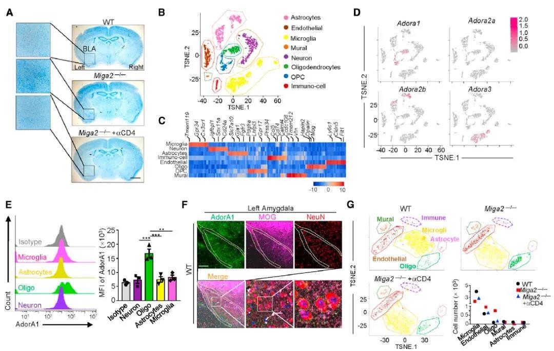 CD4 + T细胞衍生的黄嘌呤通过AdorA1作用于杏仁核的少突胶质细胞