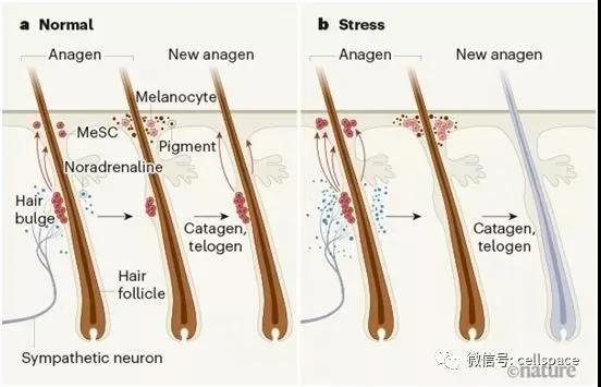 交感神经延伸到皮肤上的每个毛囊中。这些研究人员发现,压力会使这些神经释放出化学物去甲肾上腺素,这种物质会被附近的色素再生干细胞吸收。