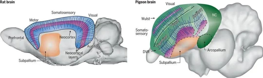 令研究人员惊讶的是,对鸽子大脑的分析结果显示,其大部分神经纤维也是纵横交错的,形成了水平方向的层状和垂直方向的柱状,与哺乳动物的皮层组织十分相似。