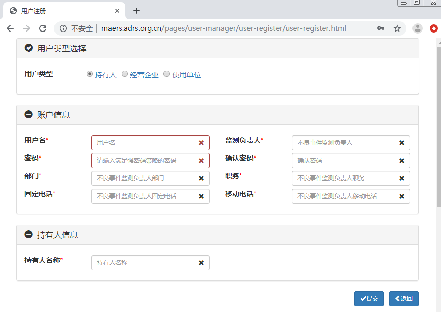 2.生产企业应选择用户类型中的“持有人”,完成用户类型选择后,系统自动弹出持有人注册界面(图3)。