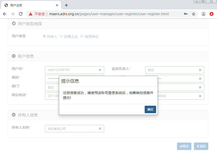3.生产企业根据系统提示完善信息,然后点击“提交”按钮,提示“注册信息成功”(图4)。
