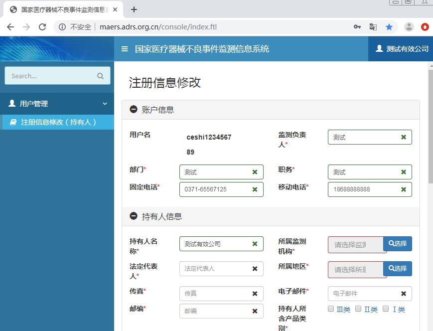 5.点击左侧“用户管理”按钮,出现“注册信息修改(持有人)”下拉按钮。