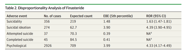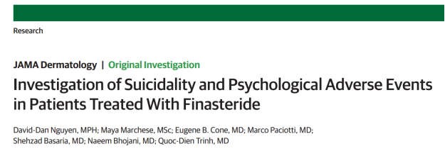 非那雄胺的使用是否与更多自发性的自杀、抑郁和/或焦虑相关?非那雄胺是一种用于治疗脱发和良性前列腺增生(BPH)的药物,其不良事件一直存在争议。2012年,开始出现男性使用非那雄胺后出现自杀倾向的报告。近日,JAMA Dermatology上发表的一篇名为Investigation of Suicidality and Psychological Adverse Events in Patients Treated With Finasteride的论文研究了自杀倾向(想法、企图和完成自杀)和心理不良事件(抑郁和焦虑)与使用非那雄胺的关系。