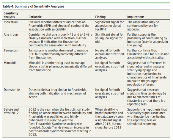 这些发现可能会引起人们的关注,与普通人群相比,年轻的脱发男性可能更倾向有自杀的风险(即指征混淆)。然而,研究者的敏感性分析发现:米诺地尔,另一种用于治疗脱发的药效学不同于非那雄胺的药物,没有发现任何自杀率的异常报告。该研究结果表明,与非那雄胺使用相关的自杀倾向和心理不良事件可能归因于年轻脱发患者用药的独特特点。