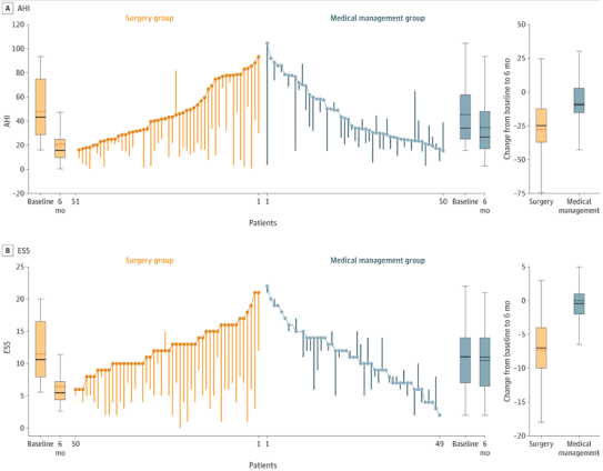 上呼吸道手术与持续药物治疗OSA患者的影响研究中的AHI和ESS结果.doi:10.1001/jama.2020.14265