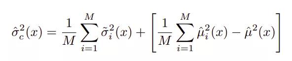 有两种类型的不确定性 —— 随机不确定性和认知不确定性,其中方差是两者的总和。对于最终的预测,单个的均值和方差可以估计,如下两个方程所示。