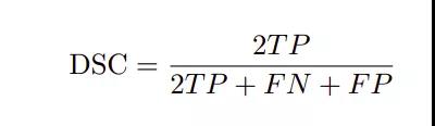 评价指标为Dice相似系数(DSC),也称F1-score和IoU。对应的方程如下所示。
