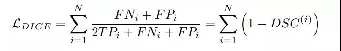 二元交叉熵损失的问题在于它没有考虑到类的不平衡,因为背景是占主导地位的类。dice损失解决了这个问题,可以写成如下公式。