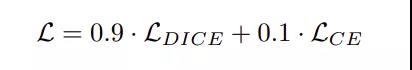这两个损失项被合并在一个项中,并给予dice损失项更多的权重,因为它能更好地处理类别不平衡问题。这是用下面的公式定义的。
