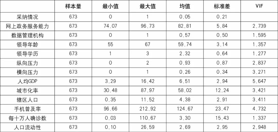 本研究因变量为政策采纳,在Logit回归模型中操作化为一个省在特定某一天采纳健康码政策的可能性。数据来源主要基于各省级人民政府办公厅、卫健委下发的有关省级健康码上线的通知。自变量包括四个维度共12个测量指标。数据主要来源于政府官网、统计年鉴、CSMAR新冠疫情与经济研究数据库以及《省级政府和重点城市网上政务服务能力调查评估报告》《数字政府发展报告》等。各变量的测量方法与数据来源参见表1。