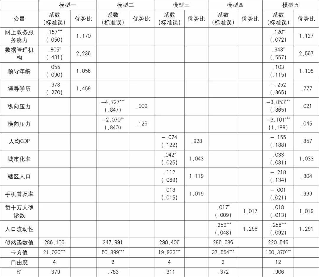 在模型一中,网上政务服务能力和数据管理机构都对健康码采纳产生了显著影响。省级政府的网上政务服务能力每上升一个单位,健康码采纳的可能性增加17%,相较于未设置省级数据管理机构的省份而言,设立了数据管理机构的省份对健康码采纳的可能性高出123.6%,假设1、2得到验证。领导年龄和学历对健康码采纳的影响并不显著,假设3、4未得到验证。在模型二中,府际关系因素与健康码政策采纳呈现显著负向关系。纵向压力每升高一个单位,也就是每一个与健康码相关的指导政策发布,都会让采纳的可能性降低到原有的0.9%;而横向压力每上升一个单位,也就是周边政府从未采纳健康码创新到全部采纳,地方政府健康码采纳的可能性降低至原有的12.6%。假设5、6未得到验证。在模型三中,只有城市化率与健康码政策采纳呈现显著正向关系,城市化率每上升一个单位,采纳可能性增加4.3%,假设8得到验证,但人均GDP、辖区人口和手机普及率对健康码采纳的影响都不显著,假设7、9、10未得到验证。模型四中人口流动性和每十万人确诊数这两个疫情防控相关因素对健康码的政策采纳都具有显著影响。各省的人口流动性指标和每十万人确诊数每上升一个单位,健康码采纳的可能性分别增加29.6%和1.7%,假设11、12得到验证。在模型五中,数据管理机构、网上政务服务能力、纵向压力、横向压力、人口流动性等变量都通过了检验,说明上述变量的稳健性较好。城市化率与每十万人确诊数未能通过模型检验,说明其在控制各类因素的前提下对政策采纳的解释力较弱。