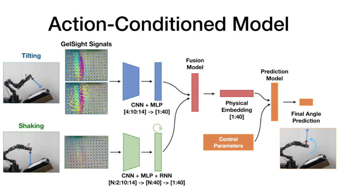 研究方法由两个主要部分组成,一个信息融合模型和一个正向动力学模型。研究人员首先让 SwingBot 执行两个动作,分别是倾斜和摇晃,这是一种手持式物理特征探测方法,帮助机器人进行触觉探索。一旦机器人学会嵌入物体的物理参数,正向动力学模型就会通过特征向量和控制参数来产生起摆运动,以实现最终的 “甩笔” 角度。