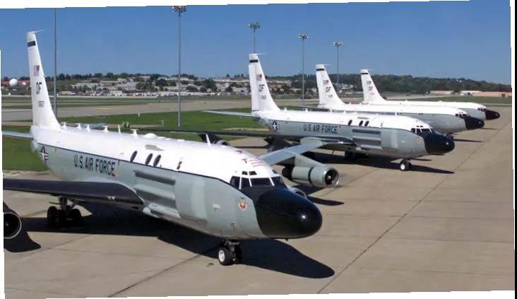 2001年,三架“眼镜蛇球”飞机非常罕见地同时出现在奥福特空军基地。后面是一架RC-135“铆钉”飞机。